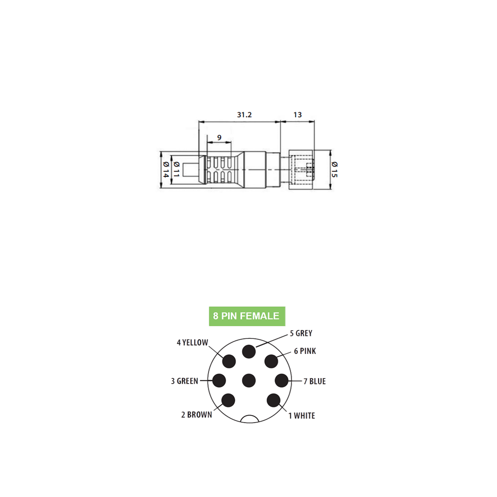 M12 Dişi, 0° Düz, 8 Pin, PVC, 2 Metre, 8 x 0,22 mm²