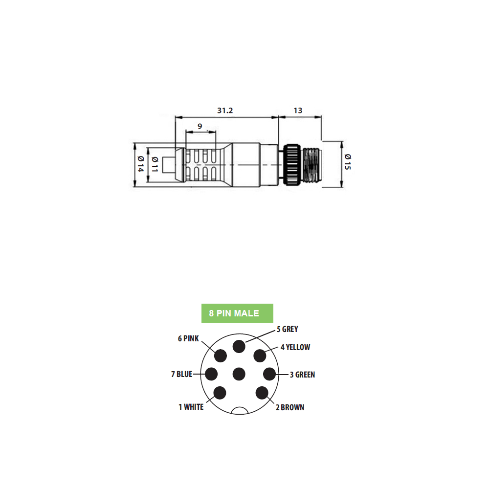 M12 Erkek, 0° Düz, 8 Pin, PVC, 2 Metre, 8 x 0,22 mm²